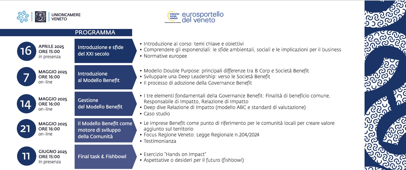 Unioncamere del Veneto in collaborazione con le cinque Camere di commercio territoriali, Confindustria Veneto Est e NATIVA, promuove un corso di formazione per approfondire gli elementi chiave del Modello Benefit al fine di supportare le imprese nell’utilizzare il proprio business come forza positiva a beneficio delle imprese e dell’ambiente.
